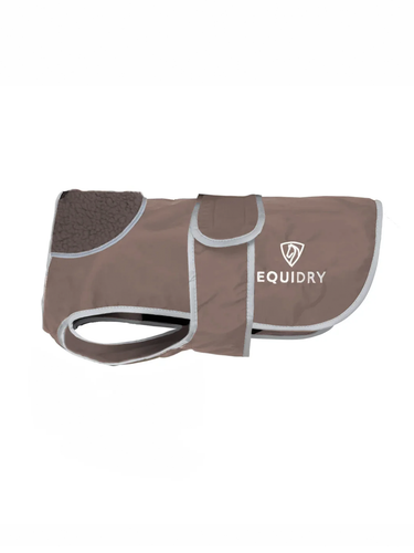 EQUIDRY Waterproof Dog Coat with soft, thin fleece lining, reflective logos & trim with lead and harness access, with an adjustable body band for chest coverage.
