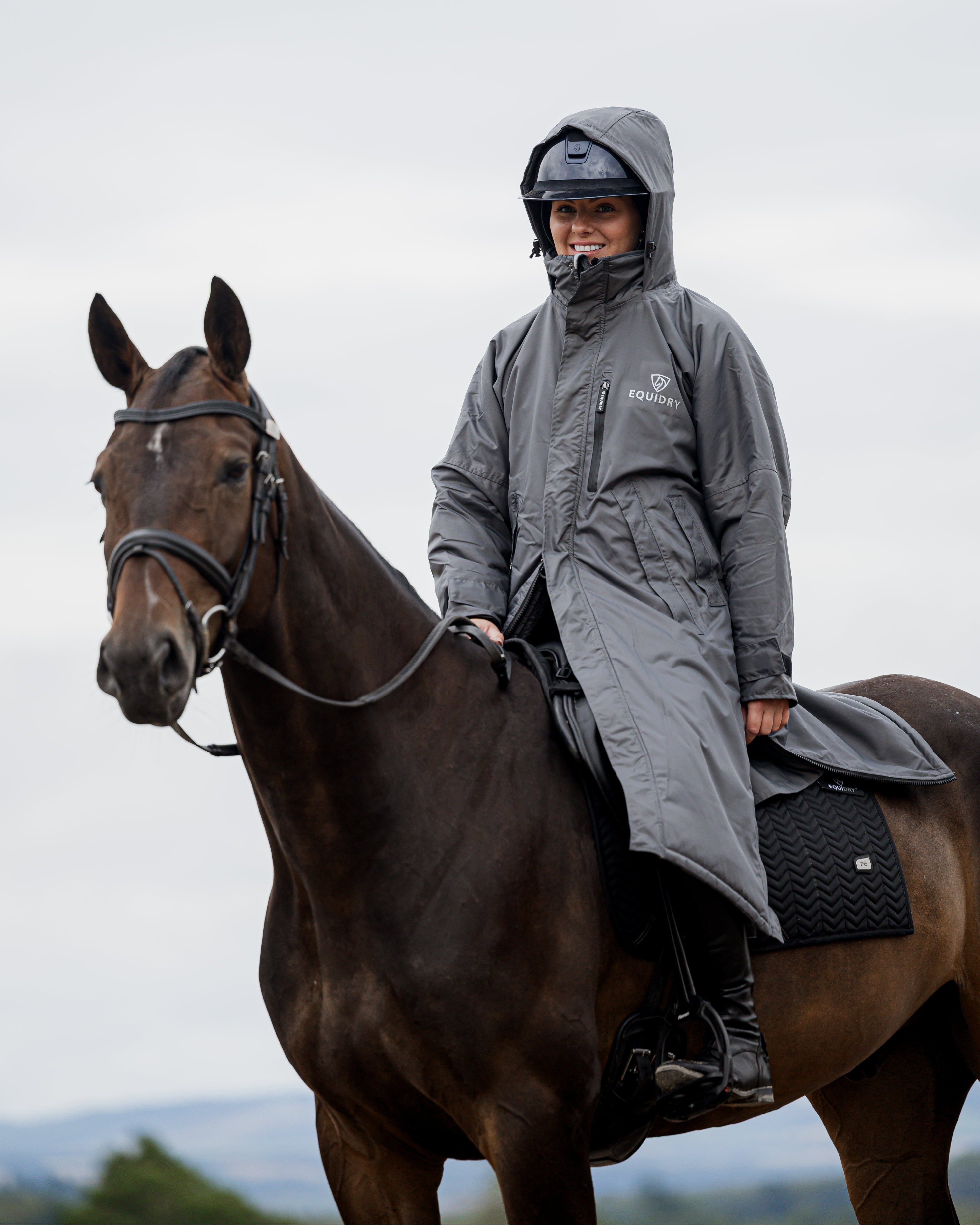 Designed to be oversized and worn full length, this performance coat boasts a remarkable 20,000mm waterproof rating, is fully breathable, fleece-lined, and layer-friendly — even fitting over a body protector.