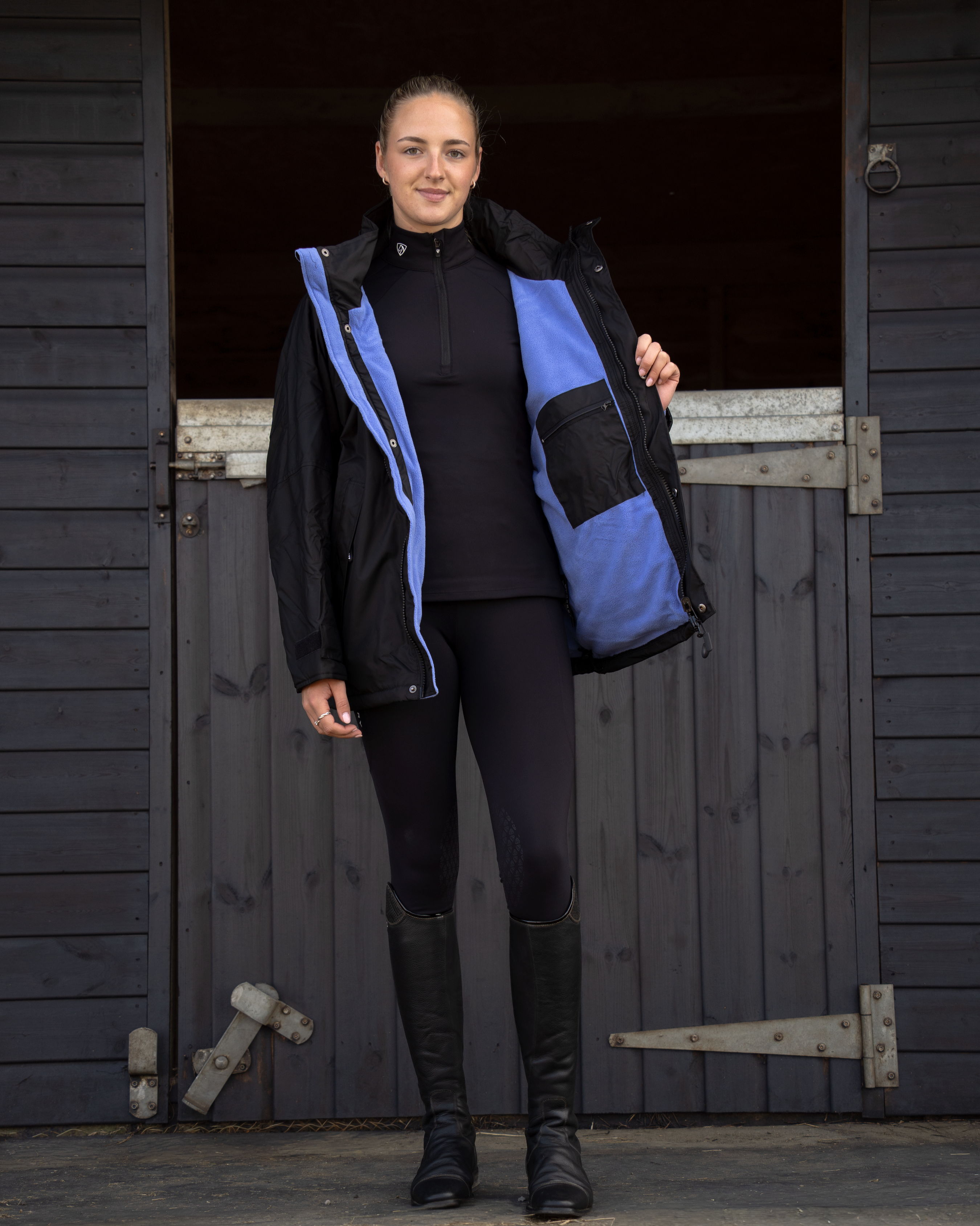 EQUIDRY women's waterproof short blouson style horse riding jacket in black/lilac EQUIDRY women's waterproof short blouson style horse riding jacket in black/lilac