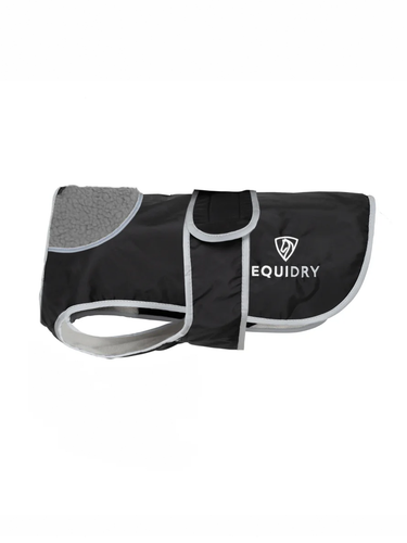 EQUIDRY Waterproof Dog Coat with soft, thin fleece lining, reflective logos & trim with lead and harness access, with an adjustable body band for chest coverage.