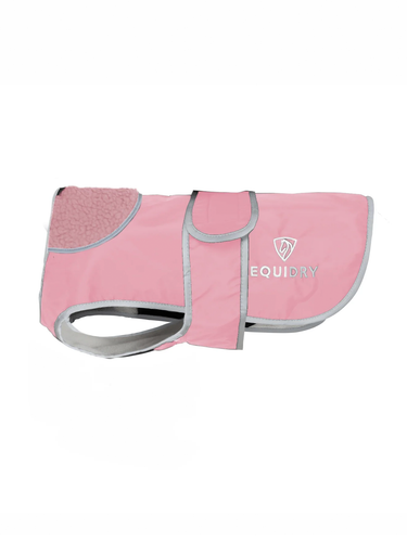 EQUIDRY Waterproof Dog Coat with soft, thin fleece lining, reflective logos & trim with lead and harness access, with an adjustable body band for chest coverage.
