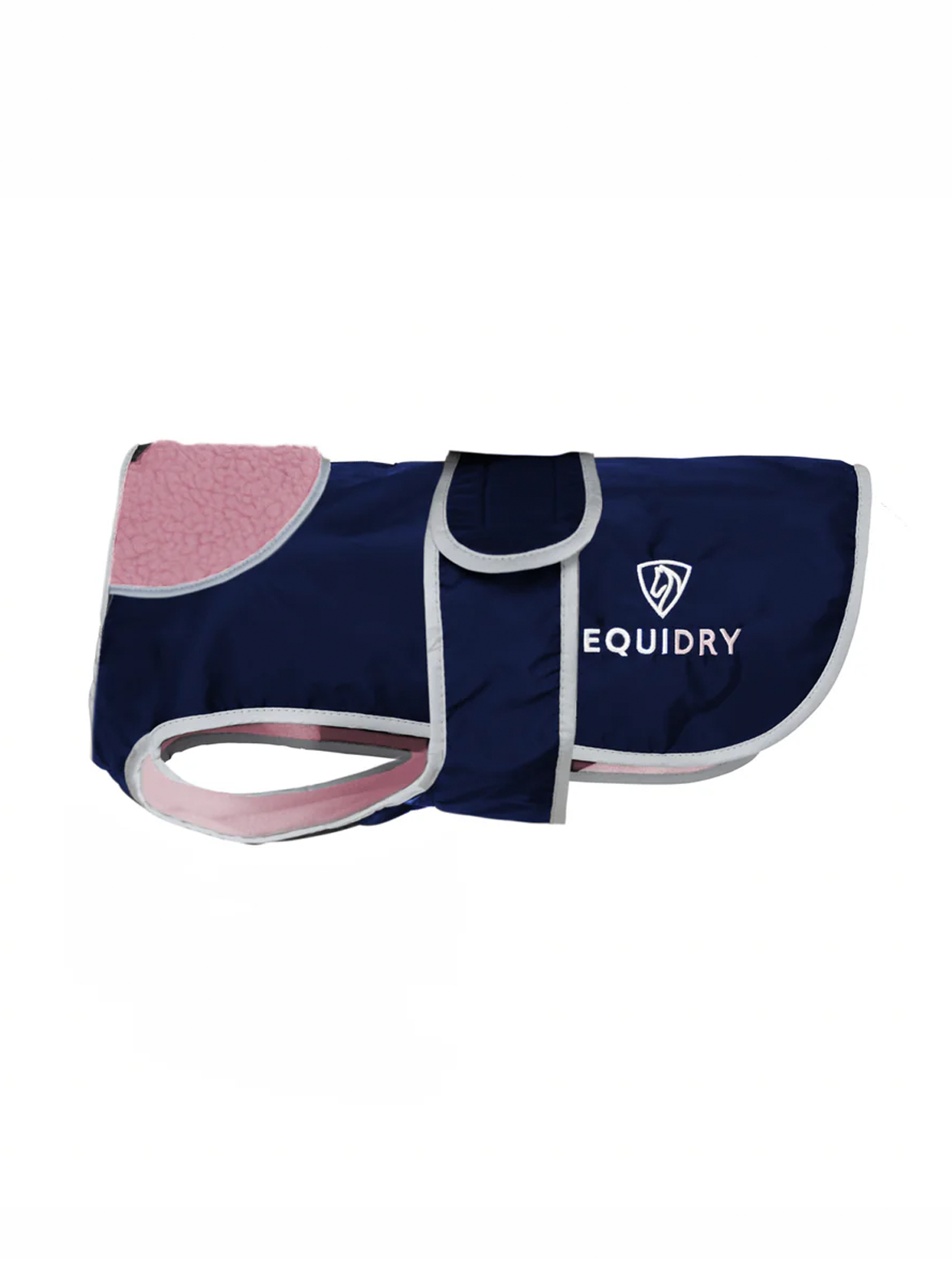 EQUIDRY Waterproof Dog Coat with soft, thin fleece lining, reflective logos & trim with lead and harness access, with an adjustable body band for chest coverage.