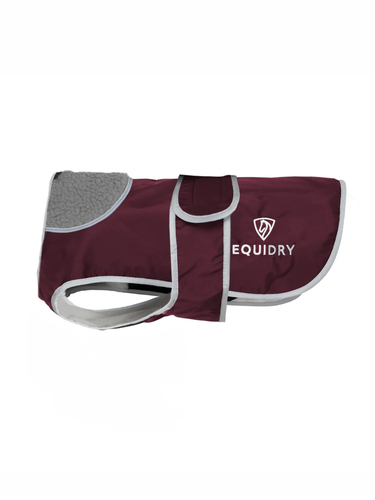 EQUIDRY Waterproof Dog Coat with soft, thin fleece lining, reflective logos & trim with lead and harness access, with an adjustable body band for chest coverage.