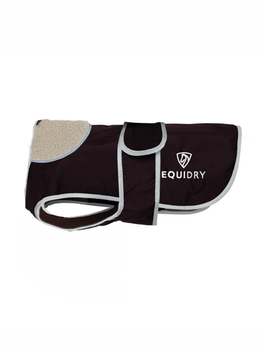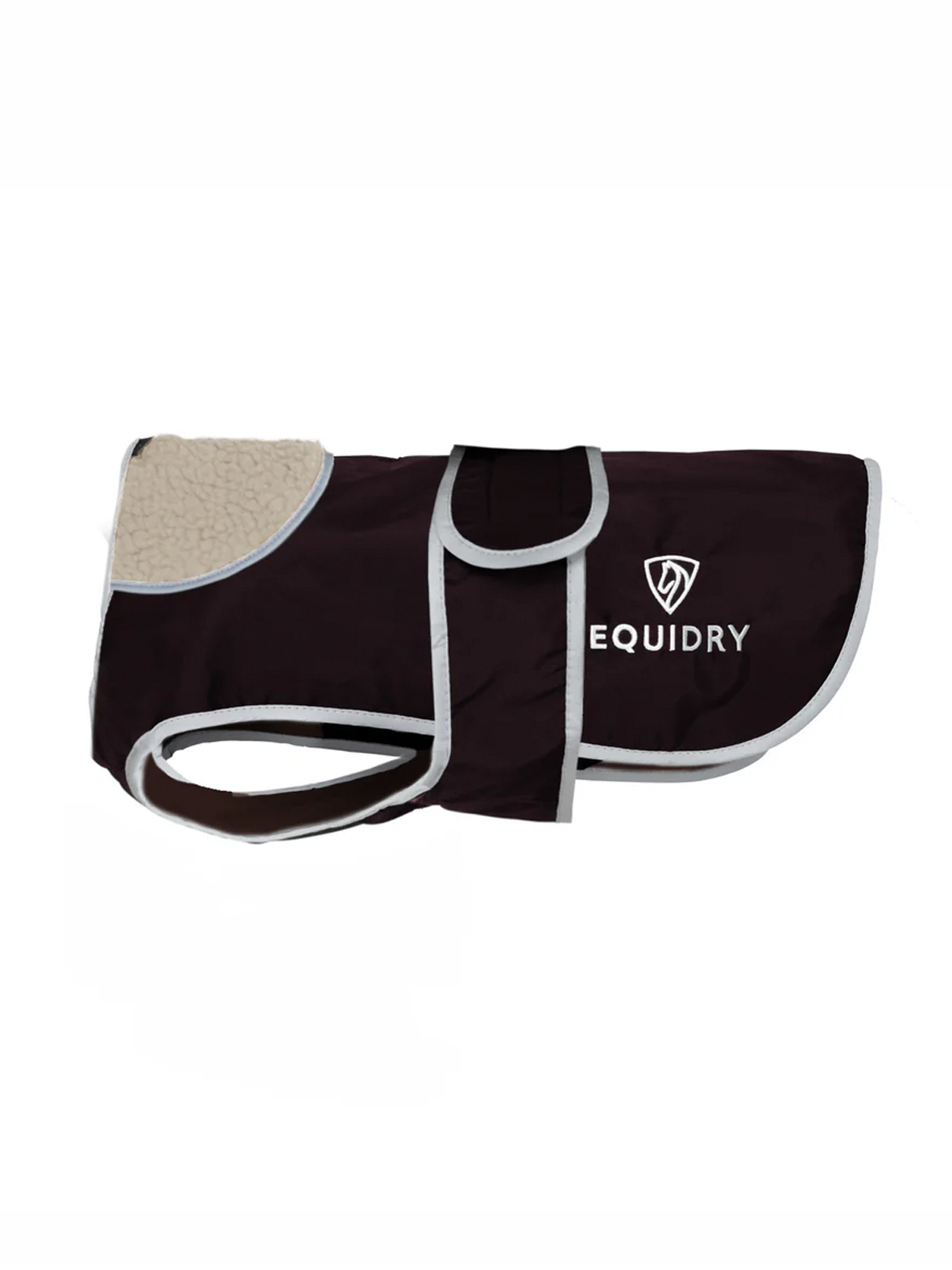 EQUIDRY Waterproof Dog Coat with soft, thin fleece lining, reflective logos & trim with lead and harness access, with an adjustable body band for chest coverage.