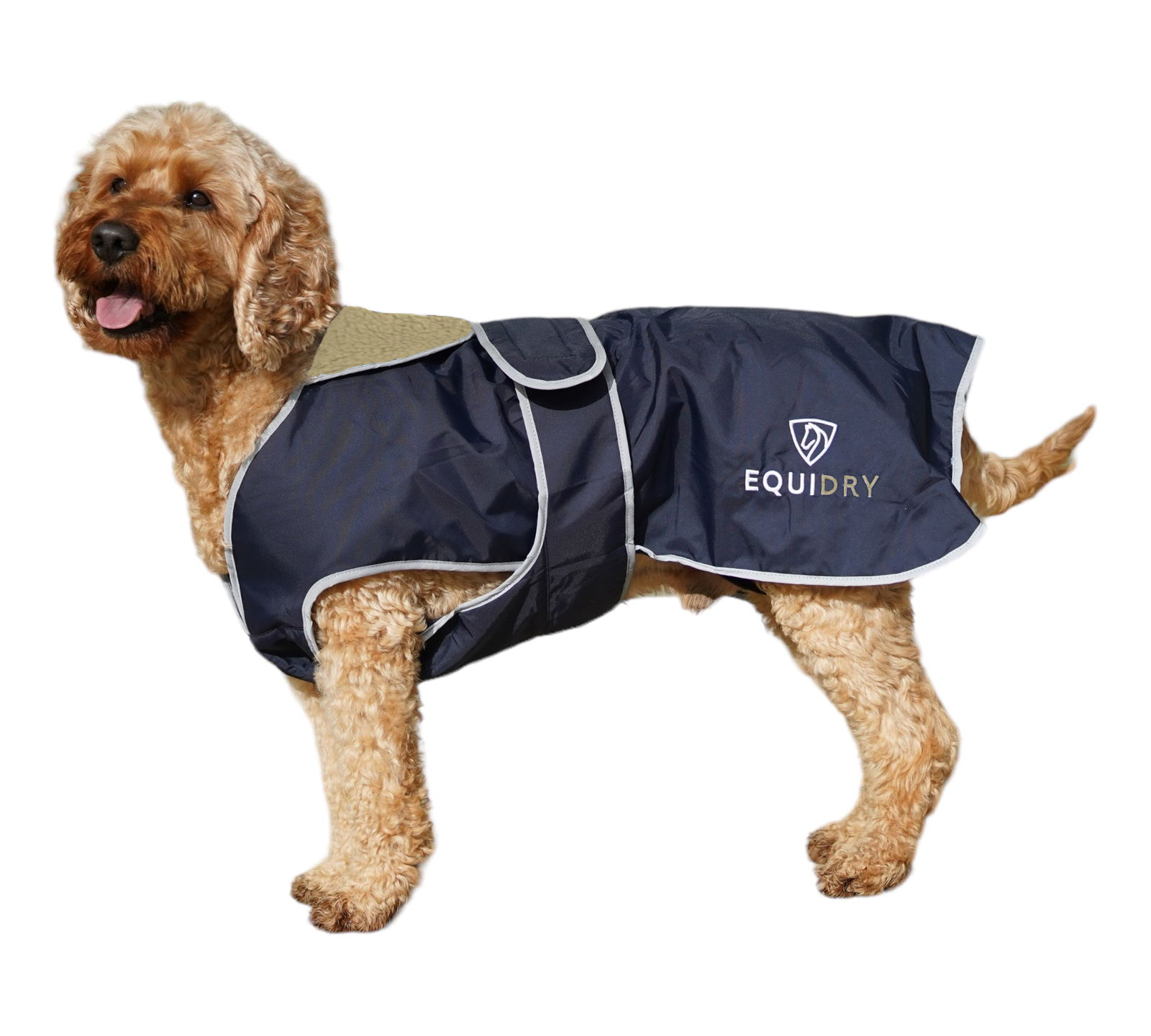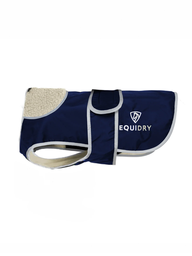 EQUIDRY Waterproof Dog Coat with soft, thin fleece lining, reflective logos & trim with lead and harness access, with an adjustable body band for chest coverage.