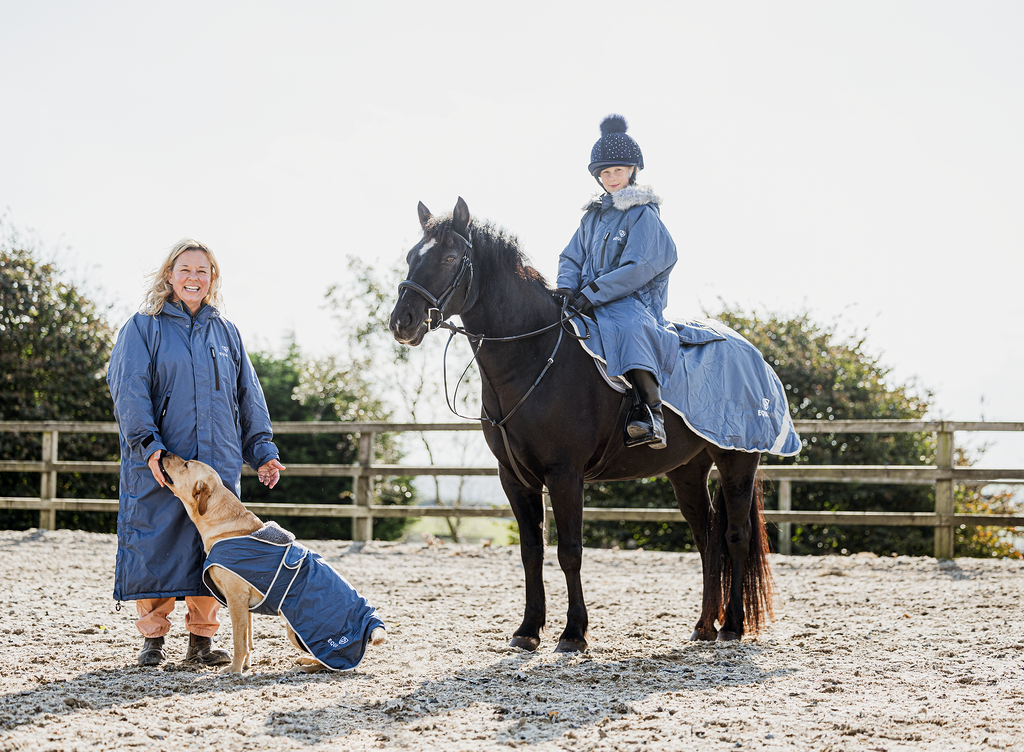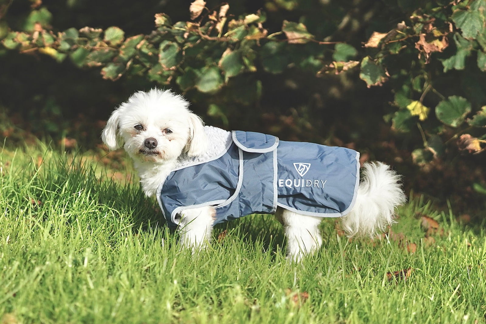 EQUIDRY Waterproof Dog Coat with soft, thin fleece lining, reflective logos & trim with lead and harness access, with an adjustable body band for chest coverage.