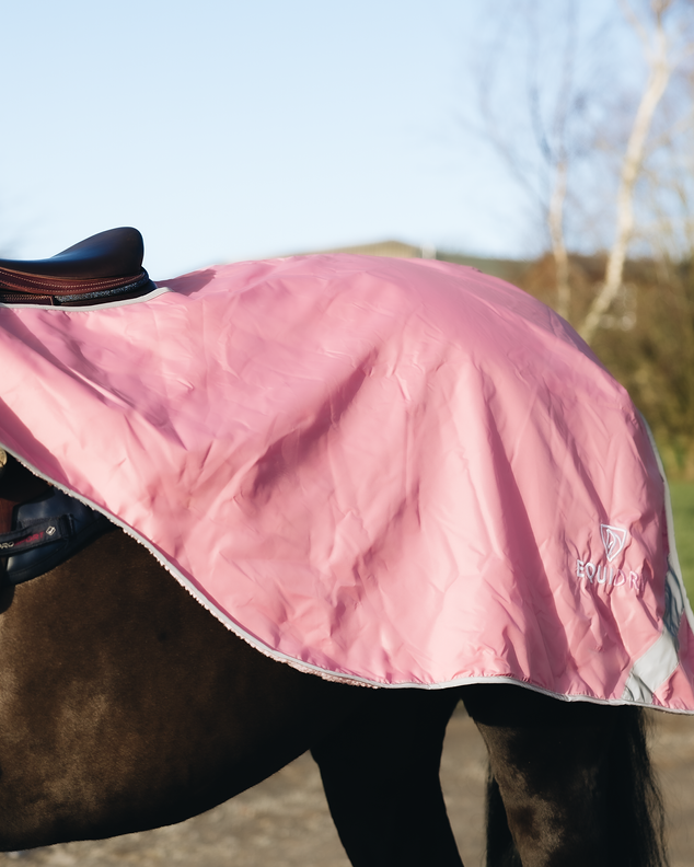 EQUIDRY Evolution Lux Women's Warm Waterproof Winter Horse Riding Coat Thick Fleece Lining with Faux Fur Trim Hood dusky pink exercise sheet on horse EQUIDRY Evolution Lux Women's Warm Waterproof Winter Horse Riding Coat Thick Fleece Lining with Faux Fur Trim Hood dusky pink exercise sheet on horse