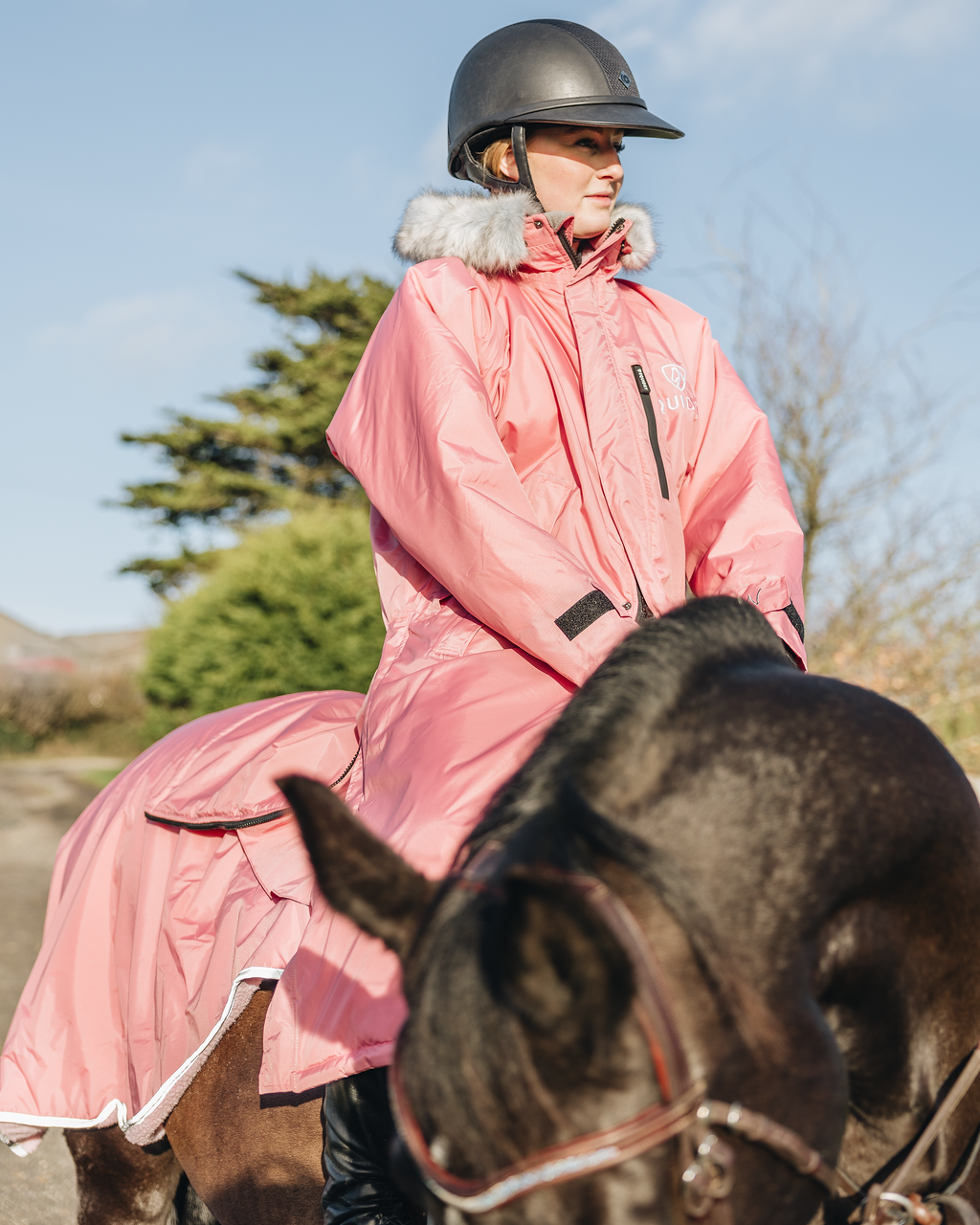 EQUIDRY Evolution Lux Women's Warm Waterproof Winter Horse Riding Coat Thick Fleece Lining with Faux Fur Trim Hood dusky pink on horse with matching exercise sheet EQUIDRY Evolution Lux Women's Warm Waterproof Winter Horse Riding Coat Thick Fleece Lining with Faux Fur Trim Hood dusky pink on horse with matching exercise sheet