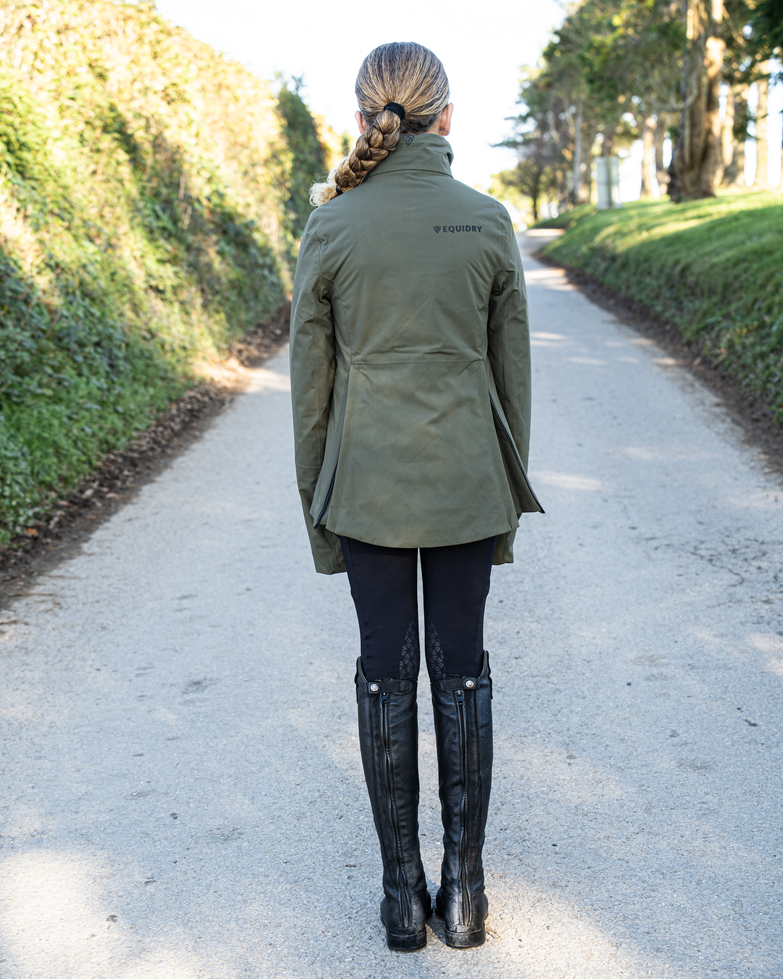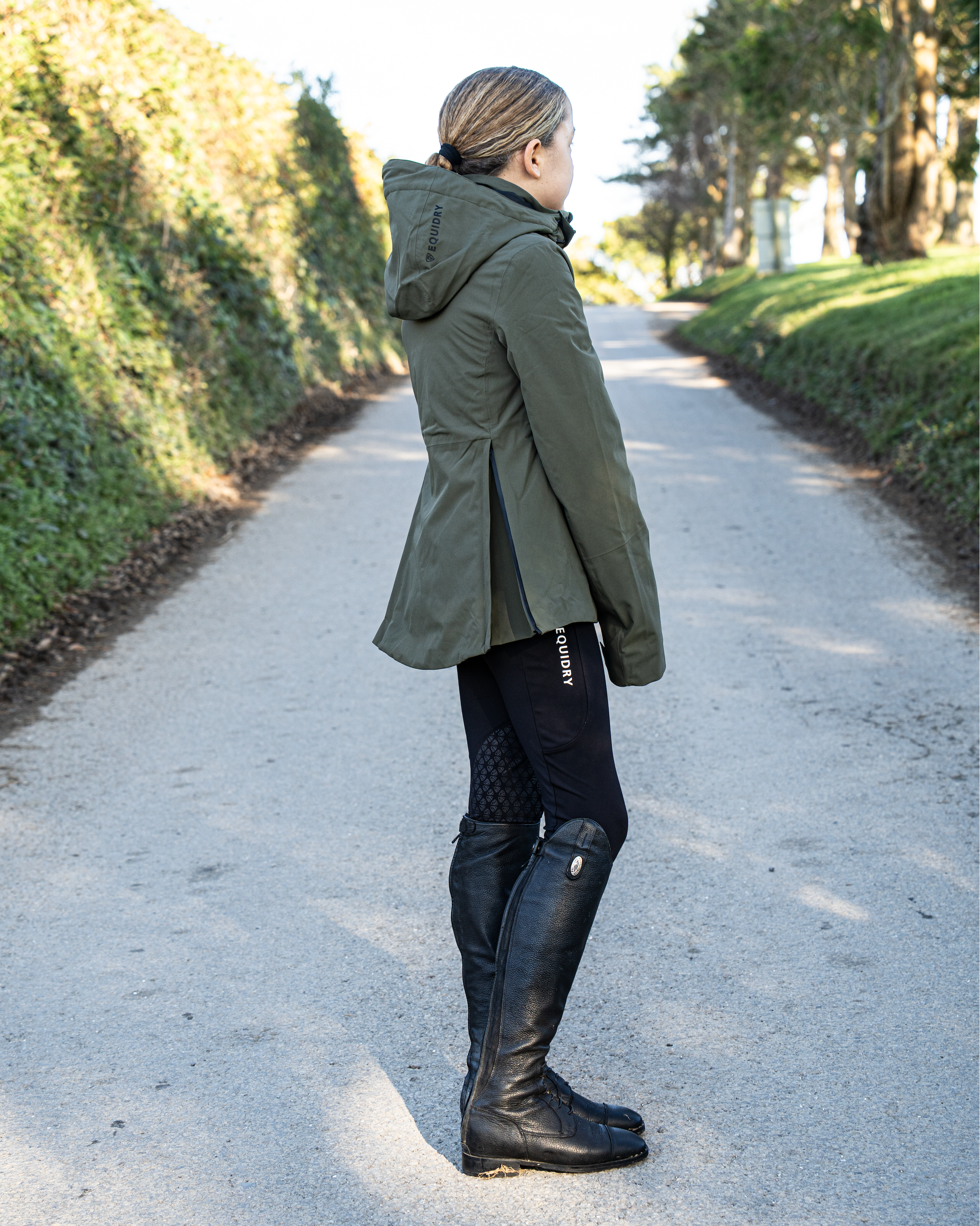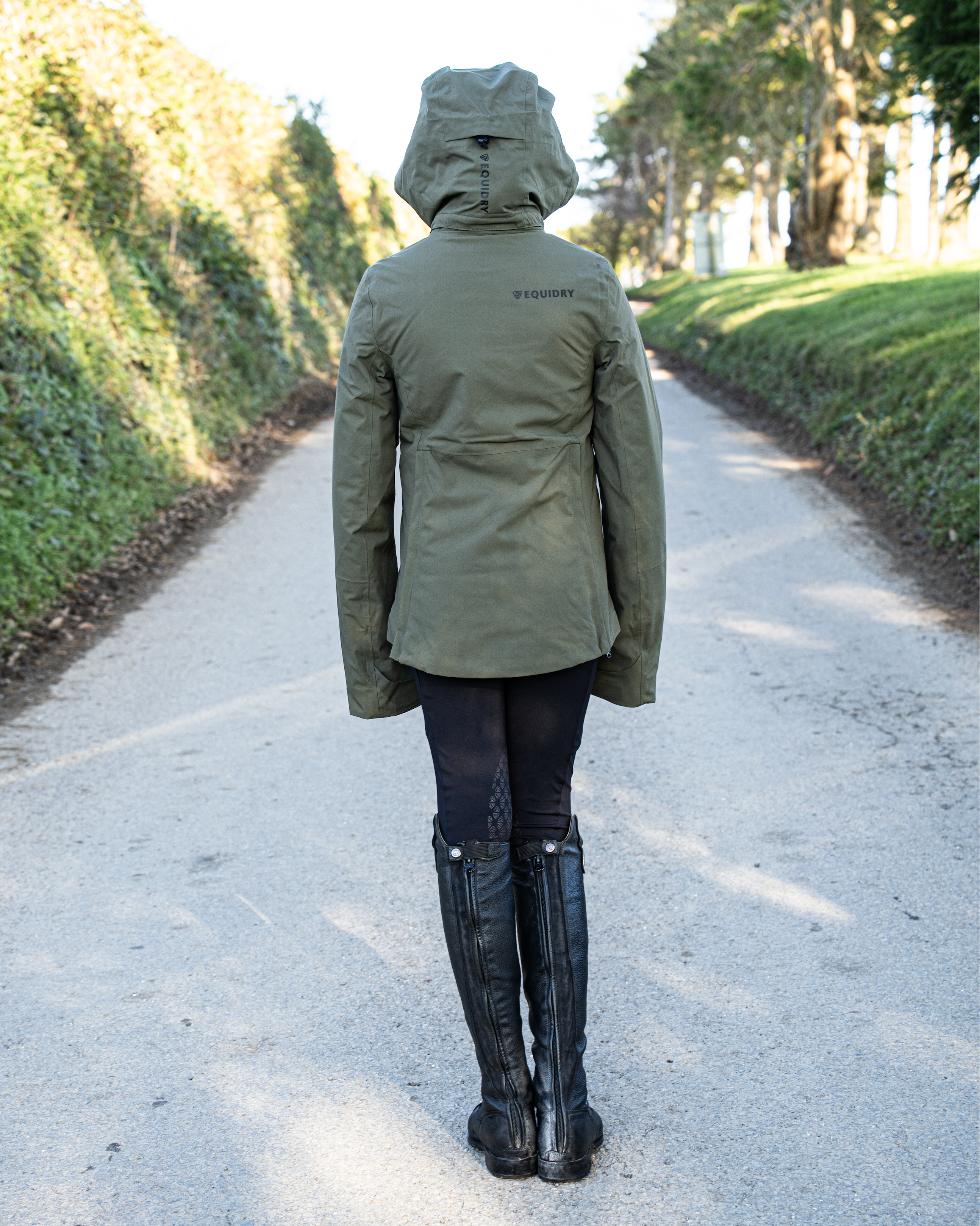 The EQUIDRY Iris Jacket is a lightweight, waterproof, and windproof layer offering 20,000mm protection and 7,000 breathability. Stylish yet practical, it features a matte ripstop outer, removable hood, and discreet vents for comfort and movement, perfect for riding or everyday wear.