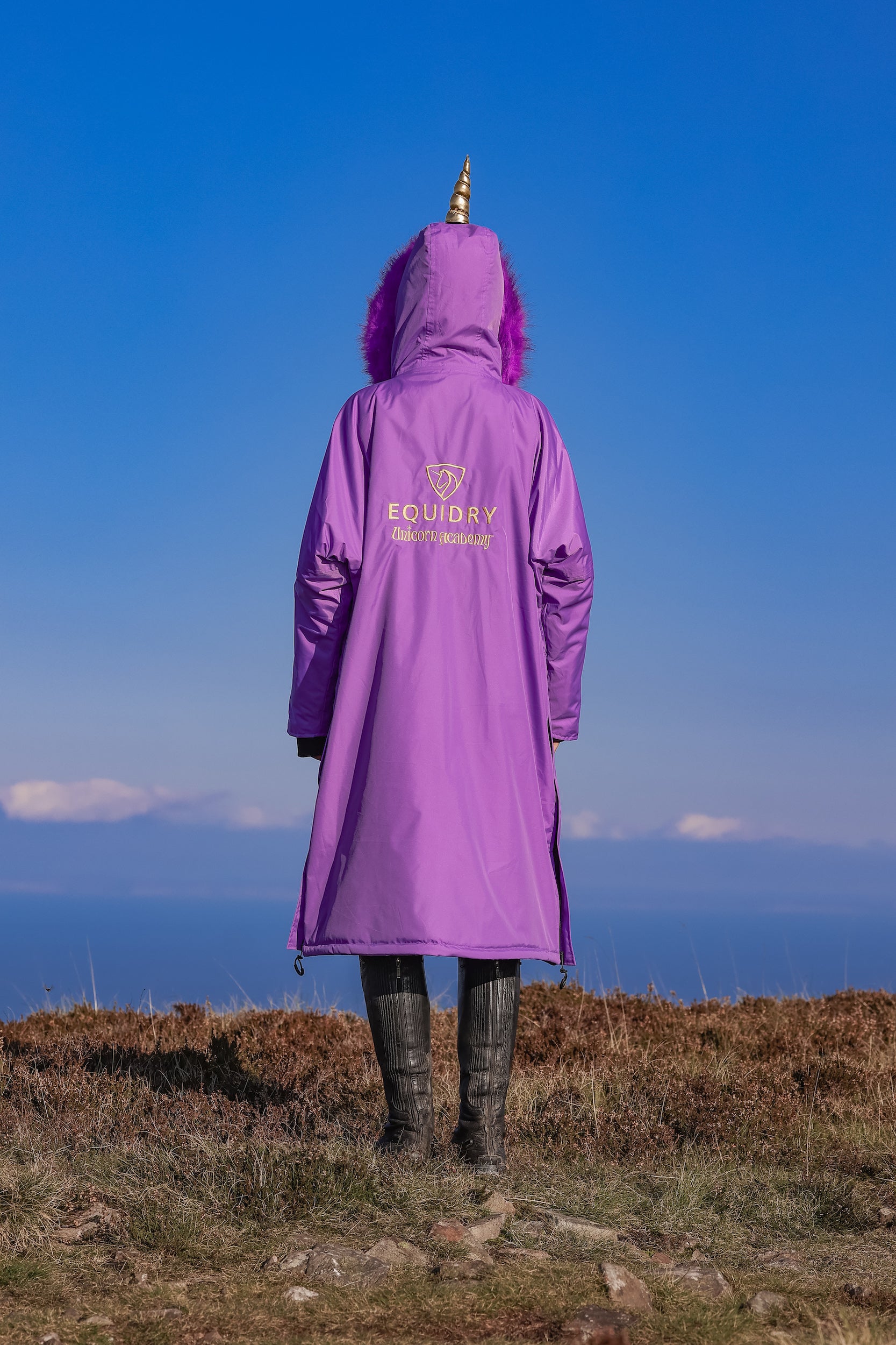 The EQUIDRY Unicorn Academy Jacket has a remarkable 20,000mm waterproof rating and is designed to be oversized and worn full length.